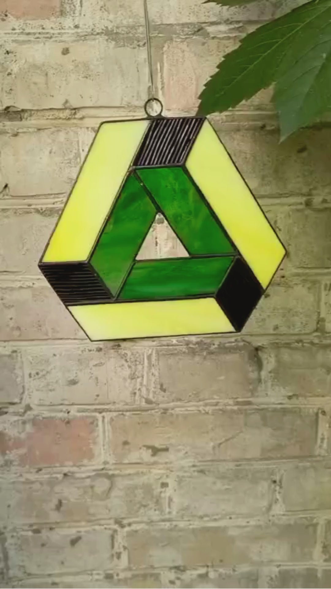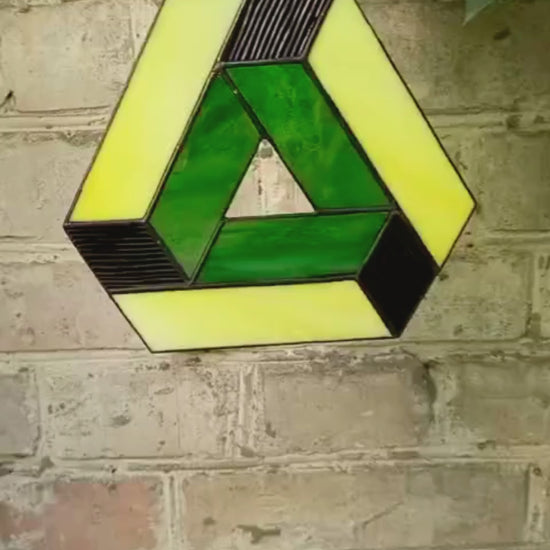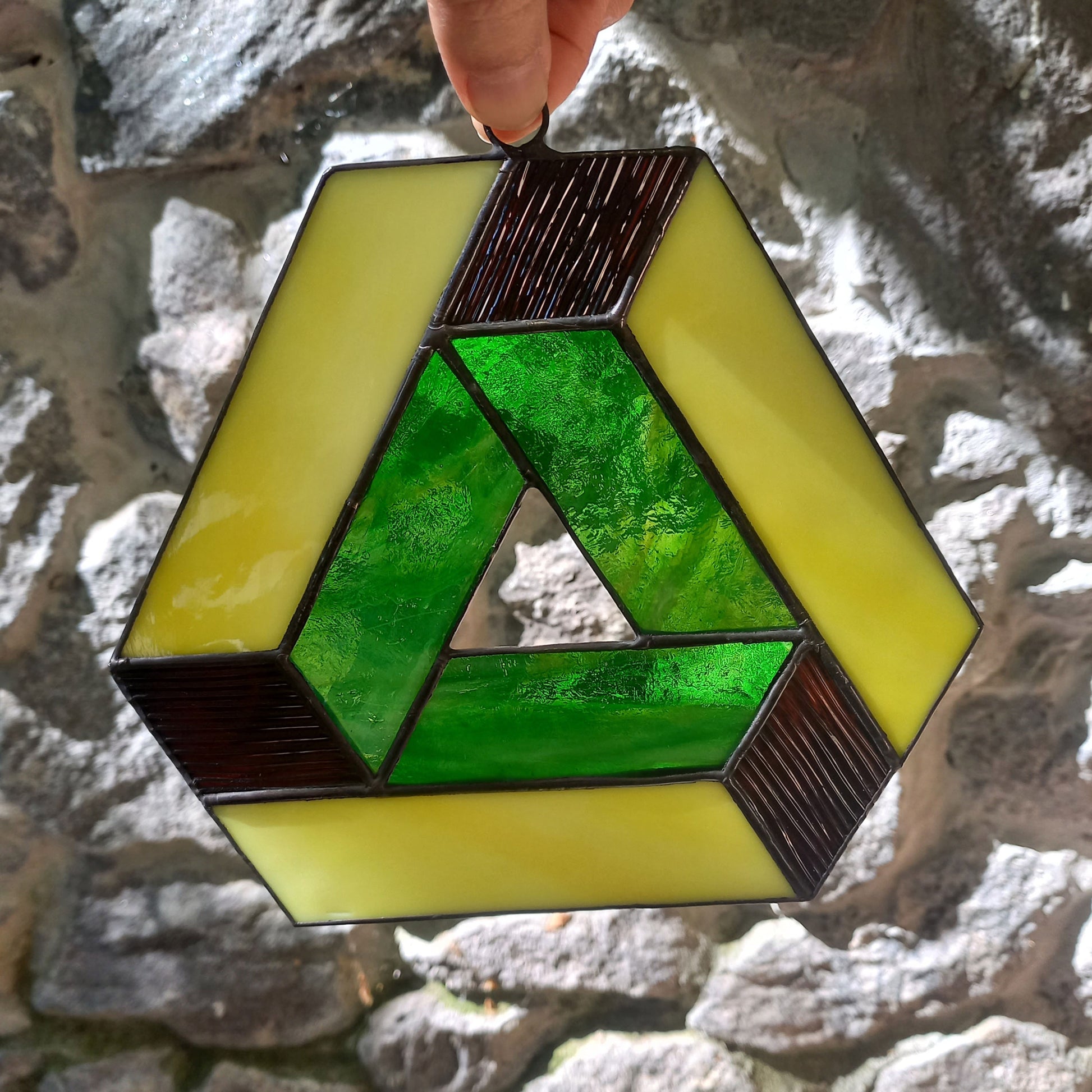 Let your space shine with the bold geometry of this stained glass suncatcher. Designed as a Penrose triangle—a famous optical illusion—it creates a vibrant 3D effect with clever angles and clean lines. Made from real stained glass in vivid yellow (almost white at the back side), lush green, and deep textured brown, the piece shifts with the light and draws the eye from every angle.
