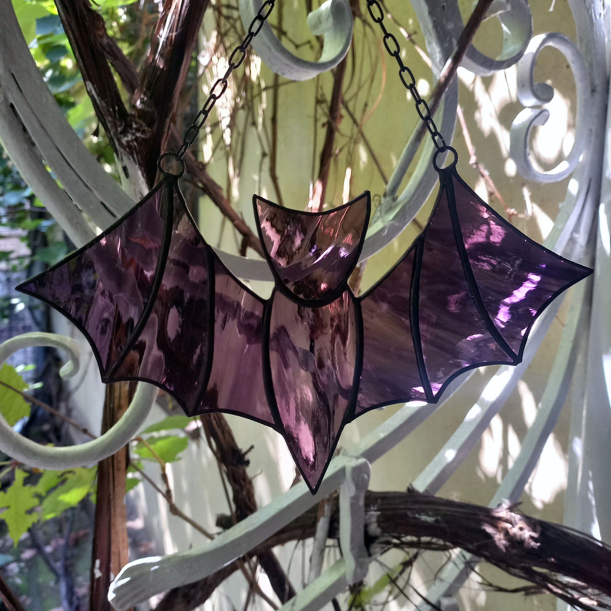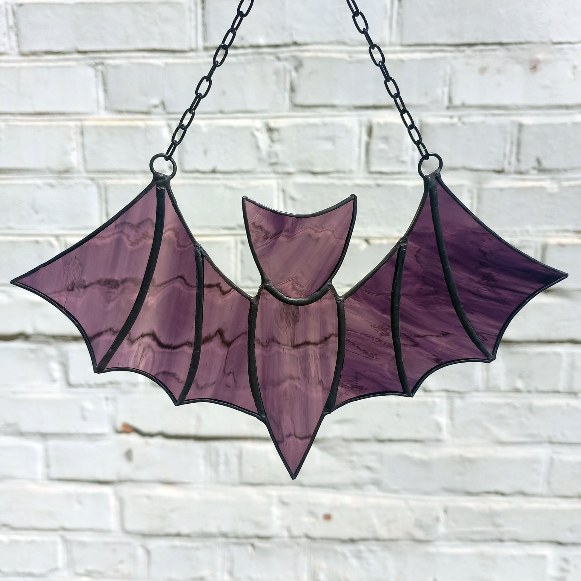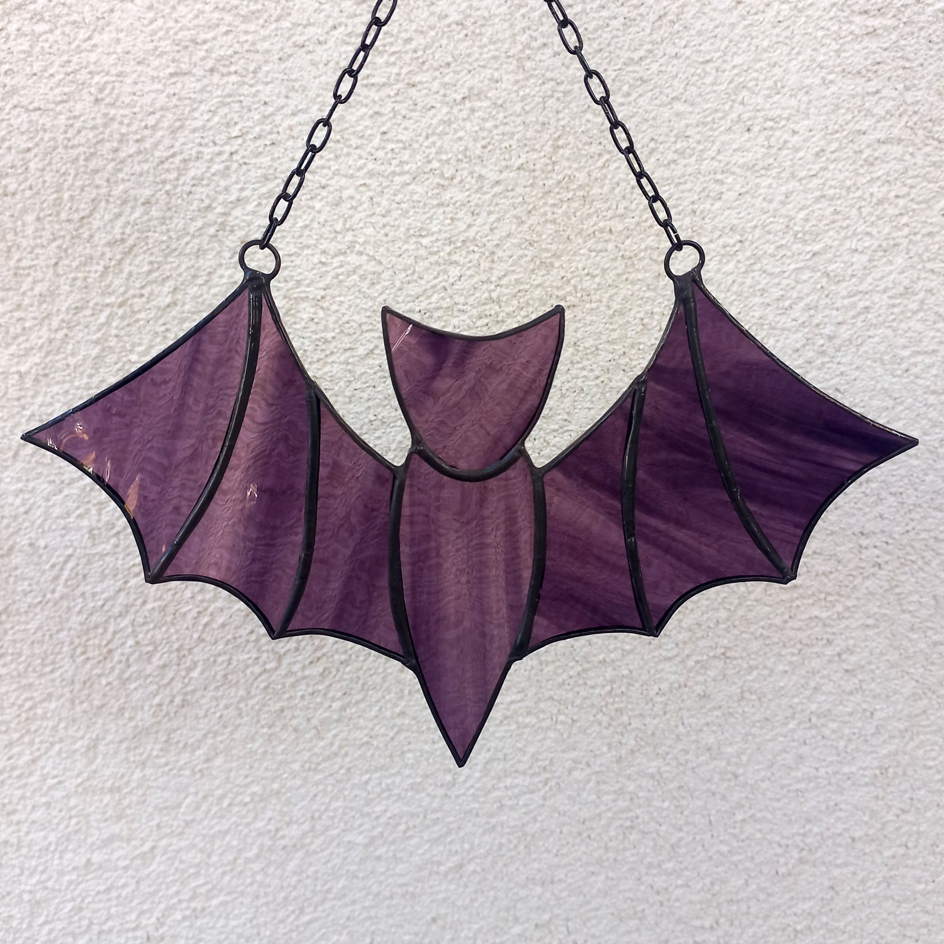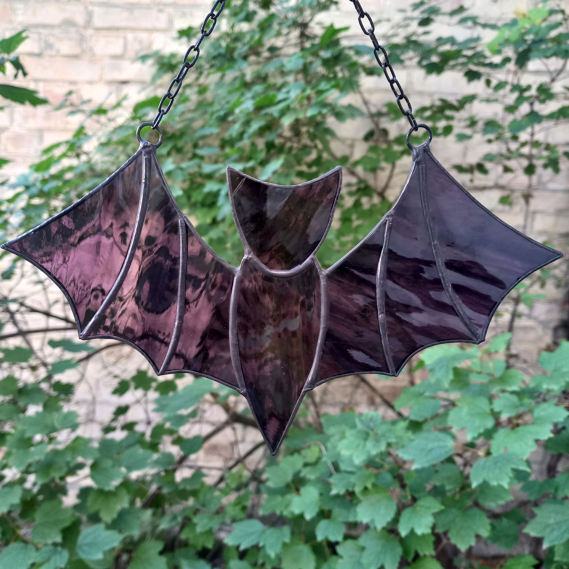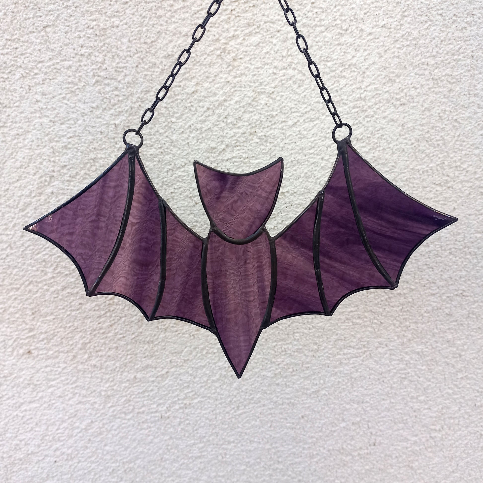 A flying bat suncatcher made of stained glass. The decoration looks black at the wall but in sunshine turns dark purple. It will fit great both as window hanging and wall decor for any room of the house, or even outdoors decor for porch or garden. Also makes an awesome addition to Gothic interiors, and to your Halloween and fall decorating.
